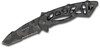 The Buck 870 Bones Folding Knife is a high-performance tool designed for reliability in demanding conditions. It features a 3-inch modified tanto blade crafted from 420HC stainless steel, known for its strength, edge retention, and corrosion resistance. The blade includes a partially serrated edge, enhancing its versatility for various cutting tasks. The tiger stripe camo finish on both the blade and the skeletal stainless steel handle adds a rugged aesthetic while reducing glare, making it suitable for tactical and everyday carry use. The ergonomic handle is designed with grip points at critical pressure areas to ensure a secure hold. The knife utilizes a frame lock mechanism for secure blade deployment and includes a thumb stud for one-handed opening. A black oxide-coated stainless steel pocket clip is included for convenient tip-up carry.