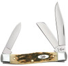 This Medium Stockman is a part of the Amber Bone CS Family. Our Amber Bone color and Peach Seed jig are signatures of the Case brand and the true heart of the Case line. Stockman's pack three blades in a convenient but very practical pocket knife. The Clip and Sheepfoot blade sit on the pocket end while the Pen blade sits on the cap end. The Clip blade is commonly used as a multi-purpose blade and preferred for detail work. The Sheepfoot blade allows for added strength at the point making it great for carving and achieving a clean cut. The Pen blade is great for light work. This knife is constructed with our Carbon (CS) steel. Some knife lovers will settle for nothing less than Carbon Steel blades, since this special formula of alloyed steel is the "original" Case blade steel. Case Carbon Steel blades are known for their edge-holding ability and easy re-sharpening. However, they are less resistant to rusting, pitting and discoloration than stainless steel. We recommend keeping a thin film of oil on the blade to maintain the finish. This ensures that your knife will be around for future generations to enjoy. Comes conveniently packaged in a box. Made in Bradford, PA, USA from domestic and imported materials.