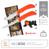 Lightweight, field-to-freezer combo with the two perfect blade designs for skinning and deboning big game, plus a ceramic/carbide sharpener to maintain a razor-sharp edge at all times. The 4.0 inch deep bellied gut-hook skinner removes hide quickly and opens game like a zipper without piercing vital organs. The 5 inch boning knife is ideal for breaking down any animal to family sized portions. 420J2 stainless steel blades are precisely heat treated to hold a great edge, and are hand finished shaving sharp. Rubberized, blaze-orange TPR handles offer high visibility in the field and ensure a nonslip grip, even when wet. Additionally, the elk horn inlay provides extra indexing points for greater control, and prevent fatigue during long use. Comes complete with a Kryptek® Highlander® nylon sheath with snap-in knife scabbard for easy removal and cleaning.